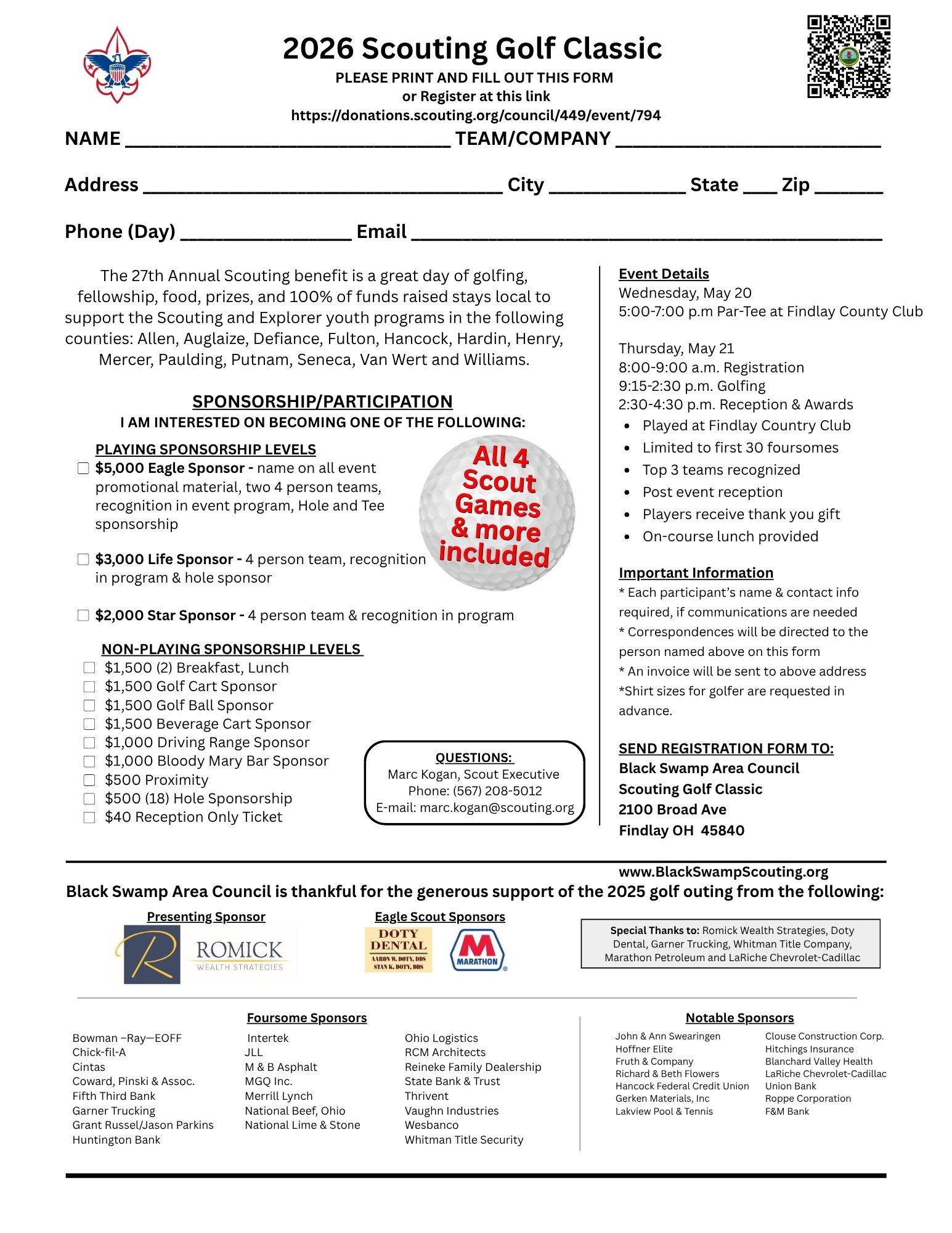 If you have any questions or wish to secure your sponsorship, please contact Marc Kogan directly at (567) 208‑5012 or marc.kogan@scouting.org. Thank you for investing in the development and future of our community’s youth.