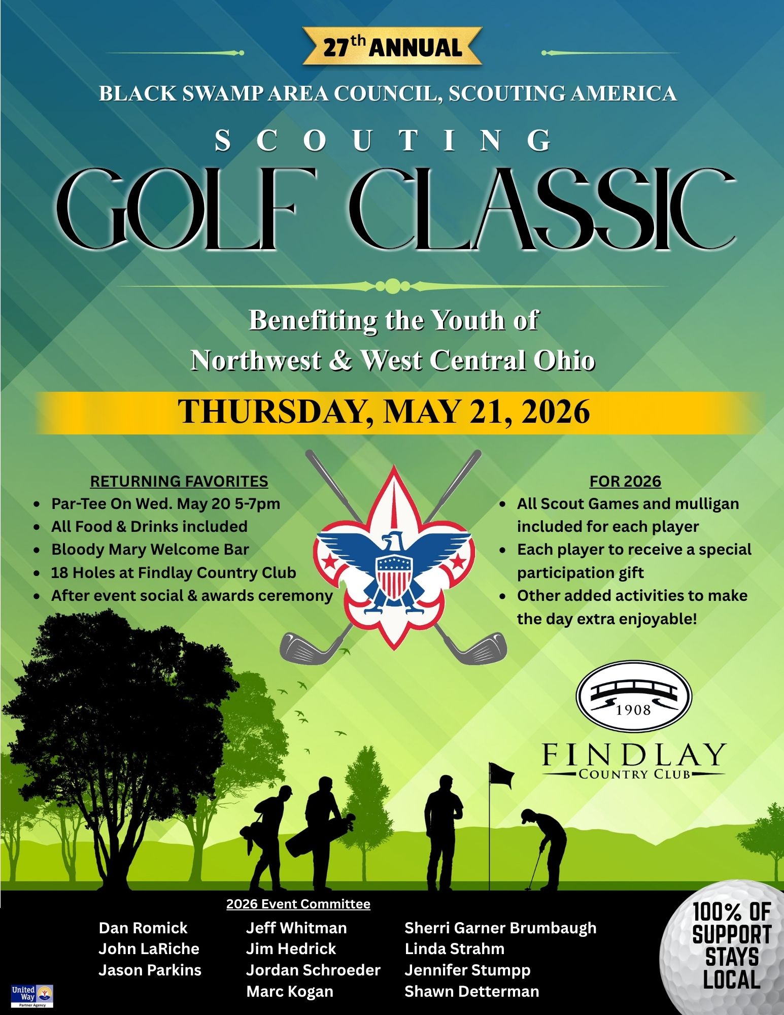 On behalf of the more than 4,000 young people and volunteer leaders served by the Black Swamp Area Council, Scouting America, the council is pleased to invite you to join us for the 27th Annual Scouting Golf Classic benefiting the youth of Northwest and West Central Ohio. This year’s event will be held on Thursday, May 21, 2026, at the beautiful Findlay Country Club.