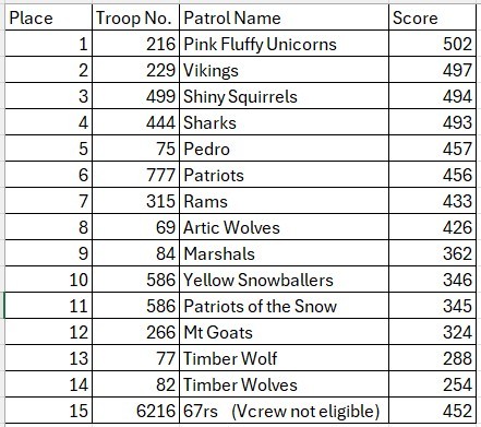 The 66th Annual Klondike Derby at Camp Lakota was cold but a wonderful day for sleds. Troop 216 finished first, followed by Troop 229, Troop 499 and Troop 444 in a Top 4 photo finish.